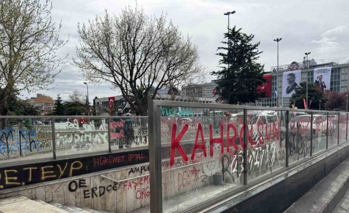 İBB’ye yönelik "yolsuzluk" soruşturmasında tutuklanan İstanbul Büyükşehir Belediye Başkanı Ekrem İmamoğlu için Saraçhane’de izinsiz gösteri yapan protestocular şehri spreyle boyadı. Burmalı Cami’nin bilgilendirme panosu ile 15 Temmuz şehitlerinin isimlerinin yazılı olduğu panoyu da boyayan protestocular milli ve dini değerleri hiçe saydı.