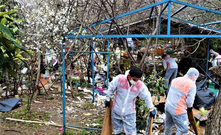 Her türlü atık ve çöple dolu ev bahçesi, ekiplerin uzun süreli çalışmasıyla temizlendi. İlgili adresten tam dört kamyon dolusu çöp çıkaran ekipler, daha sonra dezenfekte işlemi gerçekleştirdi.