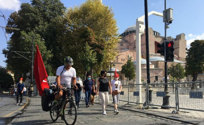 Almanya Köln’den Ayasofya’ya gelmek için 3 bin 300 kilometre pedal çeviren Recai Karacapak’ın 50 günlük yolculuğu sona erdi. Ayasofya’da olmaktan dolayı çok mutlu olduğunu söyleyen Karacapak, “Daha yollardayım, kat edecek çok kilometrem var” dedi.