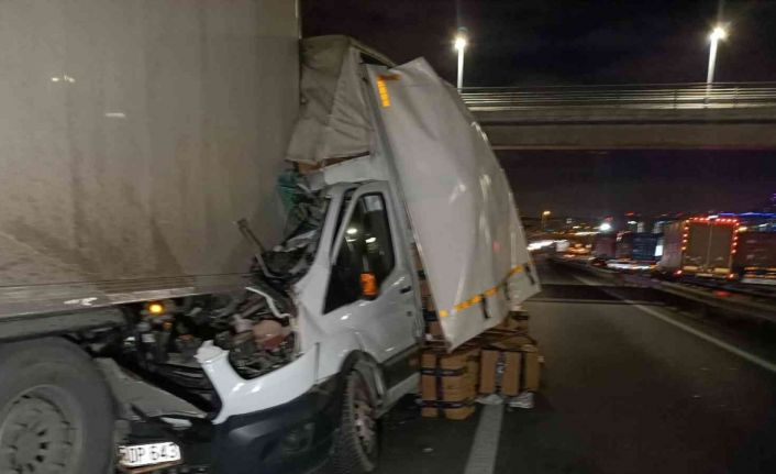 Beylikdüzü’nde park halindeki tıra arkadan çarpan kamyon sürücüsü, aracının kaputunun ezilmesine rağmen burnu bile kanamadan kamyondan çıktı. Kaza sonrası polis ekipleri bölgeye gelirken trafik bir süre tek şeritte ilerledi.