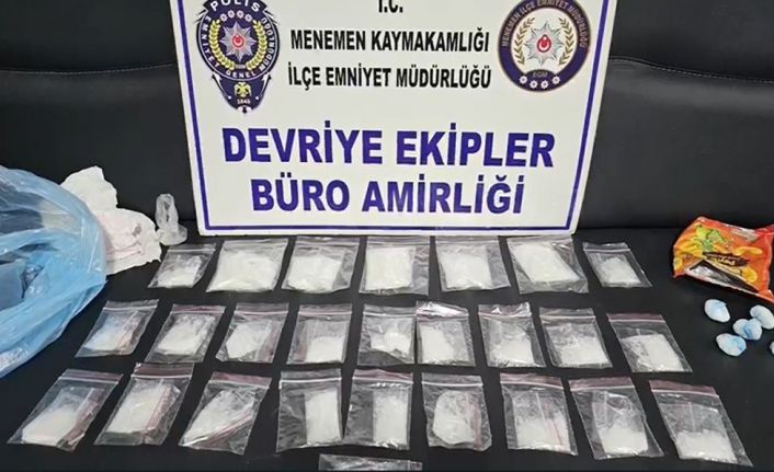 Menemen İlçe Emniyet Müdürlüğü Devriye Ekipler Amirliği ekipleri, ilçede devriye görevlerini yürüttüğü esnada şüphe üzerine 3 kişiyi durdurdu. Şahısların şüpheli tavırları üzerine Genel Bilgi Tarama (GBT) incelemesi yapılırken, M.Ö., H.D. ve G.A. oldukları belirlenen şüphelilerden 26 şeffaf poşet içerisinde 335 gram metamfetamin maddesi ele geçirildi.
