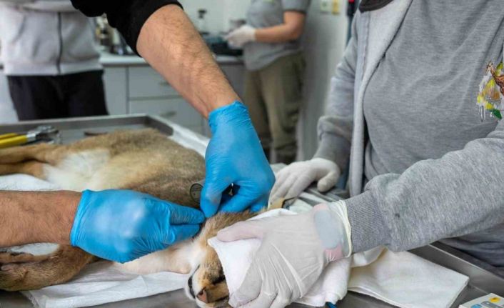 Aydın’da geçen yıl 27 Ağustos’ta Doğa Koruma ve Millî Parklar Genel Müdürlüğü (DKMP) ekipleri tarafından yaralı halde bulunan saz kedisi (Felis chaus), tedavi edilmek üzere İzmir Büyükşehir Belediyesi Veteriner İşleri Dairesi Başkanlığı’na bağlı Doğal Yaşam Parkı Kliniği’ne getirildi. Yapılan klinik ve radyografik değerlendirmelerde hayvanda kalça çıkığı, sağ femurda parçalı açık kırık ve kalça bölgesinde kırıklar tespit edildi. Ayağa kalkamadığı ve arka bacağını sürüyerek ilerlemeye çalıştığı gözlenen saz kedisinin genel durumu, uygulanan yoğun bakım ve destekleyici tedavilerle düzeltildi.