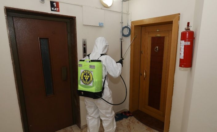 Apartmanlarında Covid 19 testi pozitif çıkan vakalar sonrasında belediyeye yazılı olarak başvuruda bulunan vatandaşların adreslerine giden ekipler, genel kullanım alanlarını baştan aşağı dezenfekte ediyor. Özel giysili dezenfeksiyon ekipleri, kapı girişlerinden merdivenlere, asansörlerden çocuk oyun alanlarına kadar tüm ortak kullanım alanlarını ücretsiz olarak detaylı bir şekilde ilaçlayarak virüsten arındırıyor.