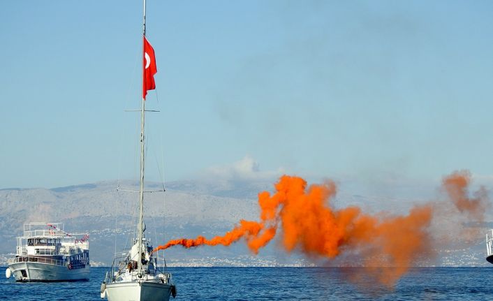 Kutlama törenine denizden de, Türk bayrakları ile donatılmış çok sayıda balıkçı teknesi ile gezi teknesi eşlik ederken, renkli görüntüler oluştu.