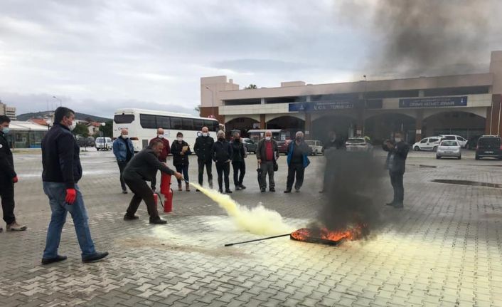 Teorik eğitimin ardından, yangın tüpleriyle yangın söndürme tatbikatı yapıldı.