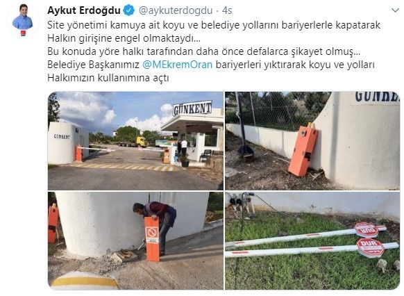 Öte yandan Erdoğdu’nun siteye girmeden önce yaptığı, "Site girişindeki nizamiye, halkın buraya girişine engel oluyor" açıklamasının ardından girişteki bariyerler de ekiplerce yıkıldı.