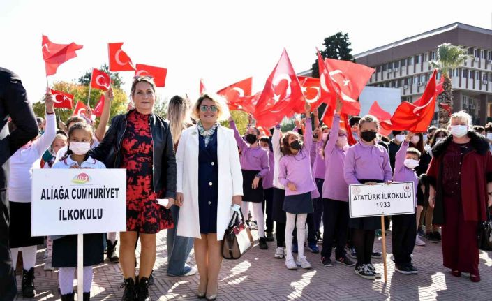 Cumhuriyet Meydanı’nda gerçekleştirilen törene Aliağa Kaymakamı Ömer Karaman, Aliağa Belediye Başkanı Serkan Acar, Garnizon Komutanı Albay Faruk Altun, kurum müdürleri, askeri erkan, siyasi parti temsilcileri, sivil toplum kuruluşları, şehit aileleri, gaziler, öğretmenler, öğrenciler ve vatandaşlar katıldı. Törende, Aliağa Kaymakamı Ömer Karaman, Aliağa Belediye Başkanı Serkan Acar ve Garnizon Komutanı Albay Faruk Altun Atatürk Anıtına çelenk sunumlarını gerçekleştirdi. Çelenk sunumlarının ardından saygı duruşunda bulunuldu ve İstiklal Marşı hep bir ağızdan okundu. Cumhuriyet Bayramı resmi programı Aliağa Kabristanlığında bulunan şehitlik ziyareti ile son buldu.