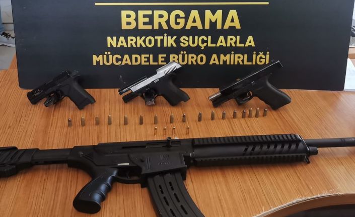 Bergama İlçe Emniyet Müdürlüğü görevlileri ve Bergama Narkotik Suçlarla Mücadele Büro Amirliği ekipleri, hakkında toplam 10 ayrı yakalama emri bulunan ve bu suçlardan 7 yıl 8 ay hapis cezası bulunan şüpheli T.B.’nin adresini belirledi. Gerçekleştirilen operasyonda şüpheli kıskıvrak yakalanırken, adreste yapılan aramada; 3 adet ruhsatsız tabanca, 1 ruhsatsız otomatik av tüfeği, 4 uyuşturucu hap ve değişik çaplarda 21 adet mermi ele geçirildi.