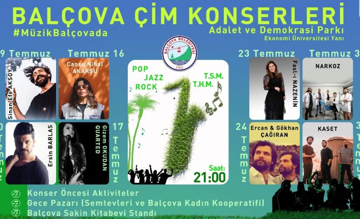 Bir yılı aşkın süredir devam eden korona virüsü kısıtlamaları nedeniyle müziğe hasret kalan İzmirliler, Balçova Belediyesinin düzenleyeceği çim konserlerinde buluşacak. 9 Temmuz Cuma akşamı ilki düzenlenecek olan konserler, bir ay boyunca her hafta cuma ve cumartesi günleri İzmir Ekonomi Üniversitesi yanındaki Balçova Adalet ve Demokrasi Parkında geçekleşecek. Konser alanında ayrıca Semt evlerinin gece pazarı ve kitap standı da olacak.