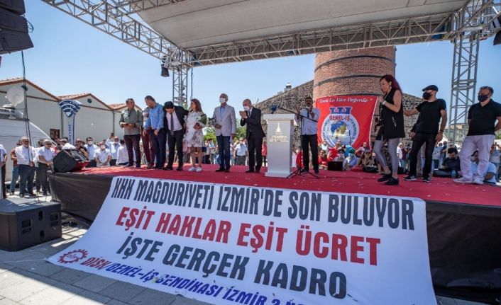 “Her mücadelenin başlangıcı ve sonu vardır. Başkanımız, ‘Aşkla İzmir’ diye göreve geldi. Eşit işe eşit ücret diye savundu ve hayata geçiriyor. Başkanımızla bir ilke imza atıyoruz. KHK ve mağduriyeti yok ediyoruz. Bu kente toz kondurmayacağız. Başkanımıza söz veriyoruz. Var gücümüzle çalışacağız."