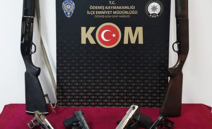 Ödemiş İlçe Emniyet Müdürlüğü Kaçakçılık ve Organize Suçlarla Mücadele (KOM) Grup Amirliği ekipleri, H.K. adlı bir kişinin kuru sıkıdan tabanca çevirdiği bilgisi üzerine çalışma başlattı. Adresi belirleyen ekiplerin Ödemiş Başsavcılığı koordinesinde gerçekleştirdiği operasyonda, adreste arama yapıldı. Yapılan aramada, 2 adet kurusıkıdan çevrilmiş tabanca, 2 av tüfeği, 2 tabanca gövdesi, 21 fişek, 1 boş kovan ve kuru sıkı tabanca çevrilmede kullanılan 19 adet parça ele geçirildi.
