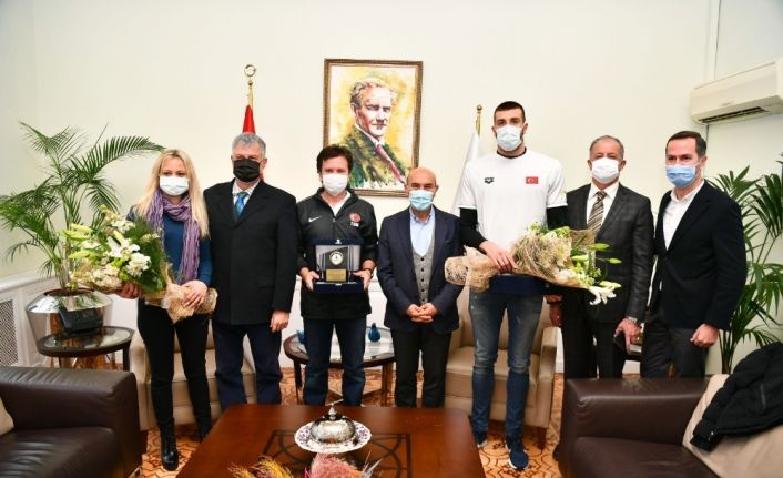 Macaristan’ın başkenti Budapeşte’de geçen Kasım ayında düzenlenen Uluslararası Yüzme Ligi’nde Avrupa rekoru kırarak birinci olan Fenerbahçe’nin milli yüzücüsü 23 yaşındaki İzmirli Emre Sakçı, antrenörleri Türker Oktay ve Bahar Oktay ile İzmir Büyükşehir Belediye Başkanı Tunç Soyer’i ziyaret etti. Programda İzmir Büyükşehir Belediyesi Genel Sekreter Yardımcısı Ertuğrul Tugay ile İzmir Büyükşehir Belediyesi Gençlik ve Spor Hizmetleri Dairesi Başkanı Hakan Orhunbilge de yer aldı.