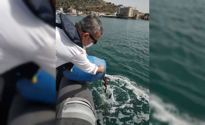KAÇAK AVLANAN DENİZ PATLICANLARI ÇEŞME MARİNA'DA DENİZE SALIVERİLDİ
