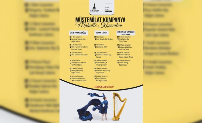 İzmir’in 21 ilçesindeki müzikseverler değişik bir deneyime hazırlanıyor. Farklı müzisyenlerin bir araya gelmesiyle oluşan Müştemilat Kumpanya, 5 Ekim’den itibaren 21 ilçede konserler verecek. İlk konser Bergama’da olacak. Dünyaca tanınmış arp sanatçısı Şirin Pancaroğlu, etkileyici yorumu ve sesiyle dinleyicilerin kalbinde taht kurmuş Serap Tamay ve Piyanist/Şef Cemile Cabbar’ın yönetimindeki Müştemilat Mandolin Orkestrası, üç ay boyunca İzmirlilere unutulmaz anlar yaşatacak. Bergama, Dikili, Urla, Kemalpaşa, Beydağ, Karaburun, Kınık, Güzelbahçe, Seferihisar, Aliağa, Menemen, Ödemiş, Kiraz, Bayındır, Menderes ve Torbalı’da gerçekleşecek konserler halka açık ve ücretsiz olacak.