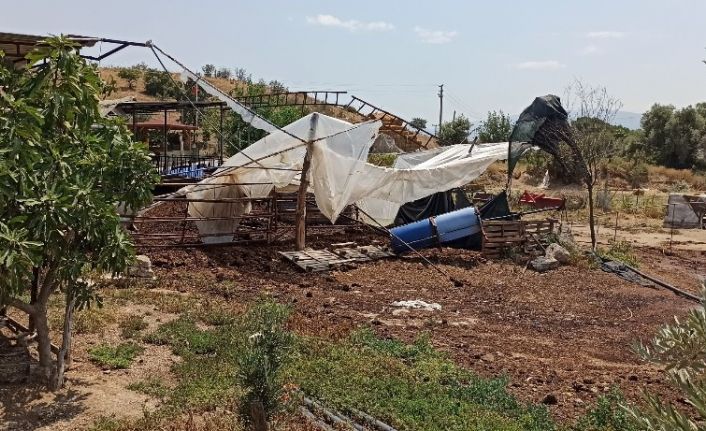 İzmir’in Ödemiş ilçesinde, aniden bastıran sağanak yağış bazı ağaçları devirirken, ahırların çatılarını uçurdu.