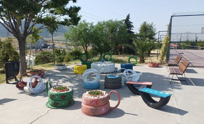 Aliağa’daki Şehit Sebahattin Karakaplan Ortaokulu’nda eğitim gören öğrenciler, çevrede atıl durumda bulunan lastikleri okula getirdi. Burada atık lastikleri boyayan öğretmen ve öğrenciler, okul bahçesinde yeni bir oturma alanı oluşturdu. Eski otomobil ve bisiklet lastiklerinden oluşturulan; sandalye, masa ve çiçek saksılıkları okula gelen ziyaretçilerin takdirini topladı.