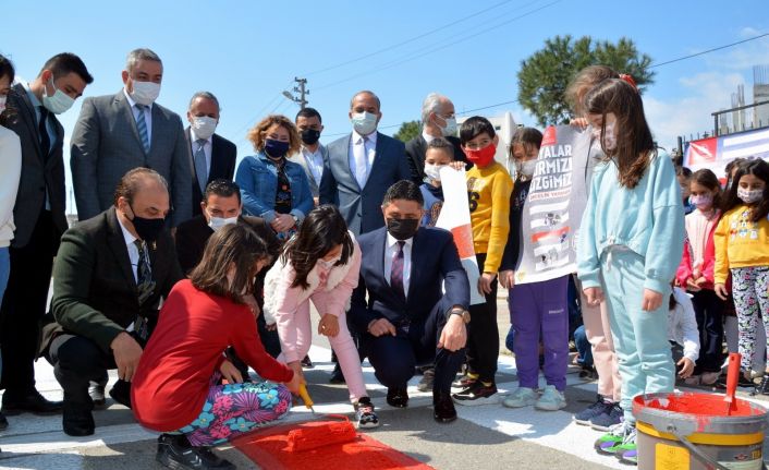 Sürücülerin yaya ve okul geçitlerine yaklaşırken yayalara ilk geçiş hakkını vermeye dikkat çekmek ve farkındalık oluşturmak için yapılan etkinlikte yaya çizgileri katılımcılar tarafından kırmızıya boyandı.