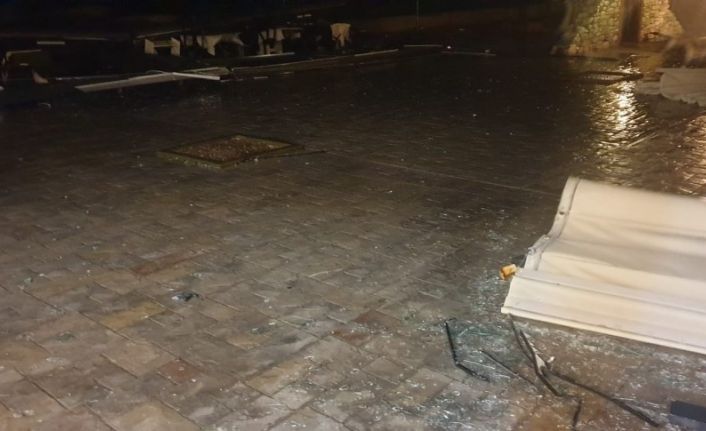 İzmir genelinde etkili olan fırtına, Urla ilçesinde de hayatı olumsuz etkiliyor. Dolu felaketinden sonra fırtına ile boğuşan ilçede belediyeye ait bir restoranın tenteleri söküldü.