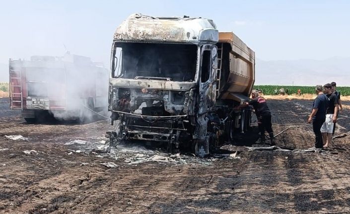 Kahramanmaraş’ta çıkan anız yangınında bir tır kullanılamaz hale geldi.
