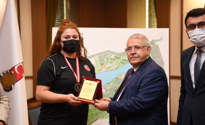 Onikişubat Belediye Başkanı Hanefi Mahçiçek, Moskova’da gerçekleştirilen Avrupa Şampiyonasında üçüncü olan Kahramanmaraşlı milli halterci Melike Günal’ı tebrik edip hediyeler verdi.