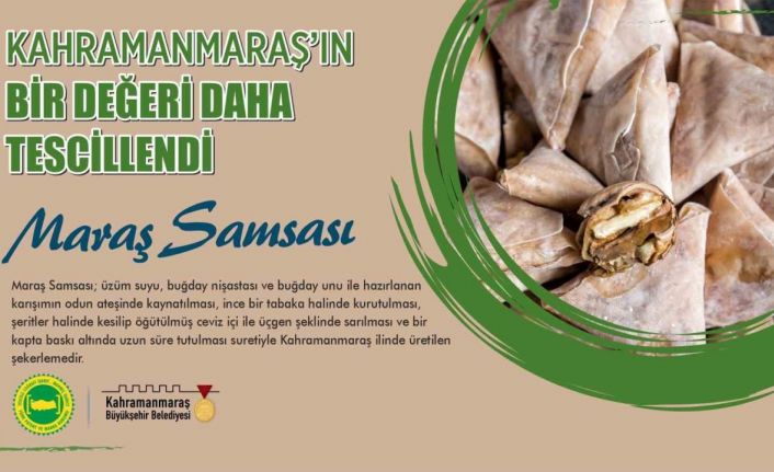 Şehrin yöresel lezzetlerini, geleneksel el sanatlarını ve kültürel değerlerini koruma altına almak için tescil başvurularını sürdüren Kahramanmaraş Büyükşehir Belediyesi, şehrin mutfak kültüründe önemli bir yere sahip olan Maraş Samsası’nı da Türk Patent ve Marka Kurumu’na tescil ettirdi.Büyükşehir Belediyesi, Sütçü İmam Üniversitesi Teknik Bilimler Meslek Yüksekokulu Gıda İşleme Bölümü ve İl Tarım ve Orman Müdürlüğü iş birliğiyle yapılan başvurunun ardından Maraş Samsası, Türk Patent ve Marka Kurumu tarafından yapılan incelemelerin ardından hazırlanan 143 Sayılı Resmi Coğrafi İşaret ve Geleneksel Ürün Adı Bülteni’nde yayımlanarak şehrin koruma altındaki ürünleri arasında yerini aldı.