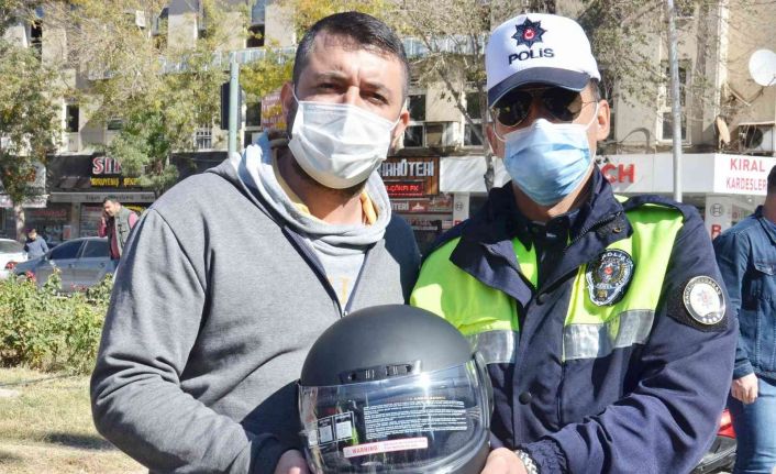 Kahramanmaraş’ın Elbistan ilçesinde polis ekipleri, ‘Bir kask bir hayat’ projesi kapsamında kaskı olmayan motosiklet sürücülerine kask hediye etti.