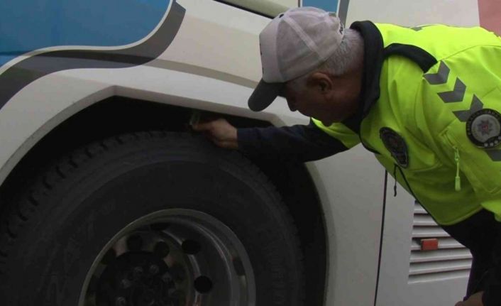 Lastik derinlik ölçme kumpasıyla yapılan denetimlerde, lastik derinliğinin 4 milimin altında kalıp kalmadığına dikkat edilirken, sürücülere kış lastiği kullanımının öneminden bahsedildi.