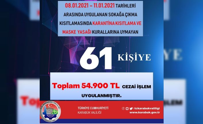 Karabük’te 56 saatlik sokağa çıkma kısıtlamasında karantina ve kısıtlama kurallarını ihlal eden 61 kişiye 54 bin 900 TL idari para cezası uygulandı.