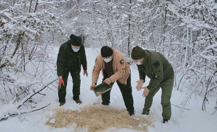 Karabük’te kış şartlarında yiyecek bulmakta zorlanan yaban hayvanları için ormanlık alana saman ve buğday bırakıldı.