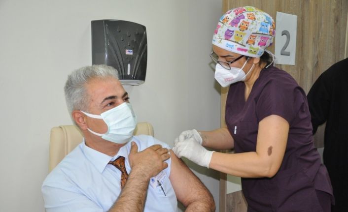 Karaman İl Sağlık Müdürü Adnan Kurşun ve sağlık yöneticileri Karaman Eğitim ve Araştırma Hastanesinde ilk doz aşıyı oldu.
