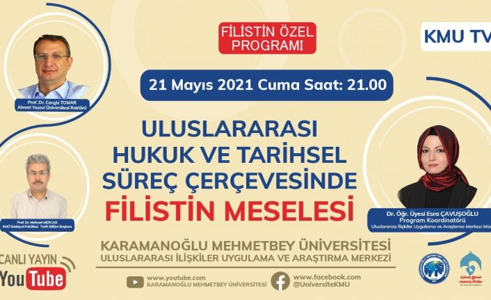 KMÜ’den konuyla ilgili yapılan açıklamada, resmi Youtube ve Facebook hesaplarından canlı olarak verilecek olan yayının 21 Mayıs Cuma günü saat 21.00’de izleyiciyle buluşacağı belirtilerek, "KMÜ Uluslararası İlişkiler Uygulama ve Araştırma Merkezi Müdürü Dr. Öğretim Üyesi Esra Çavuşoğlu’nun koordinatörlüğünde yürütülecek programda, uluslararası hukuk ve tarihsel süreç çerçevesinde Filistin meselesi ele alınacak. Programın konukları Ahmet Yesevi Üniversitesi Rektörü Prof. Dr. Cengiz Tomar ile KMÜ Edebiyat Fakültesi Tarih Bölüm Başkanı ve Uygulamalı Bilimler Yüksekokulu Müdürü Prof. Dr. Mehmet Mercan olacak. Programa ilişkin soru ve görüşler üniversitenin sosyal medya hesaplarından iletilebilecek. Programın yayımlanacağı sosyal medya hesapları şöyle: https://www.youtube.com/channel/UCI-8ZOK_VN-NEZKQEt2w-Gw , https://www.facebook.com/UniversiteKMU" denildi.