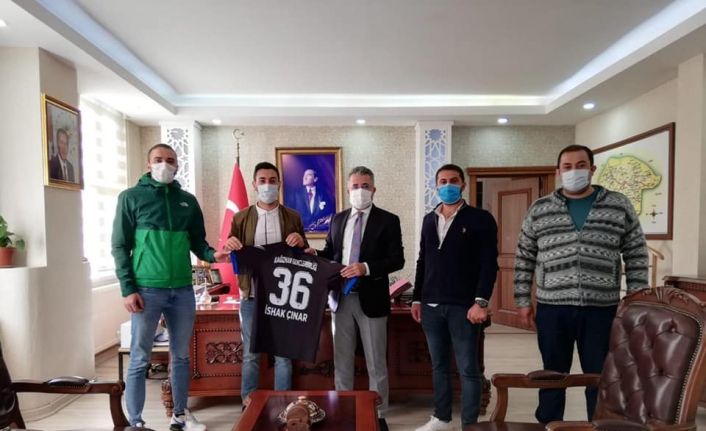 Bölgesel Amatör Lig (BAL) Ligi’nde 2020-2021 sezonunda Kars’ı temsil edecek Kağızman Gençlerbirliği Spor yöneticileri ziyaret ettikleri Kaymakam İshak Çınar ve Belediye Başkanı Nevzat Yıldız’a 36 numaralı formayı hediye ettiler.