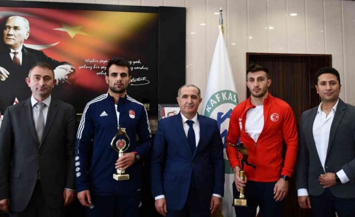KAÜ Rektörü Prof. Dr. Hüsnü Kapu, Türkiye’yi Dünya Boks Şampiyonası’nda temsil etmeye hak kazanan öğrencileri makamında kabul ederek, kendilerine teşekkür belgelerini ve hediyelerini verdi.