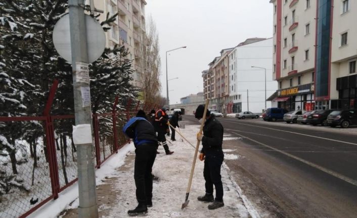 Ekipler, buz tutan kaldırımlarda tuz çalışması yaparken, cadde ve sokakların karı temizlenerek kamyonlarla kent dışına çıkarıldı.