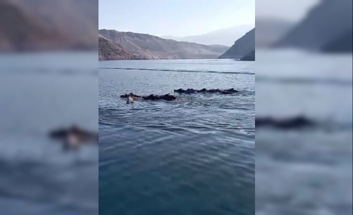Karakurt Baraj Gölü’nde çekilen görüntülerde gölün ortasında karşı kıyıya geçmek için yüzen 19 domuz sürüsü yer alıyor. Domuz sürüsüyle balıkçılar arasındaki diyalog ise gülümsetti.