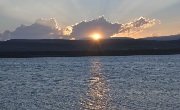 Gün batımıyla birlikte kızıla bürünen güneşin baraj gölüne yansıması görenleri büyüledi.