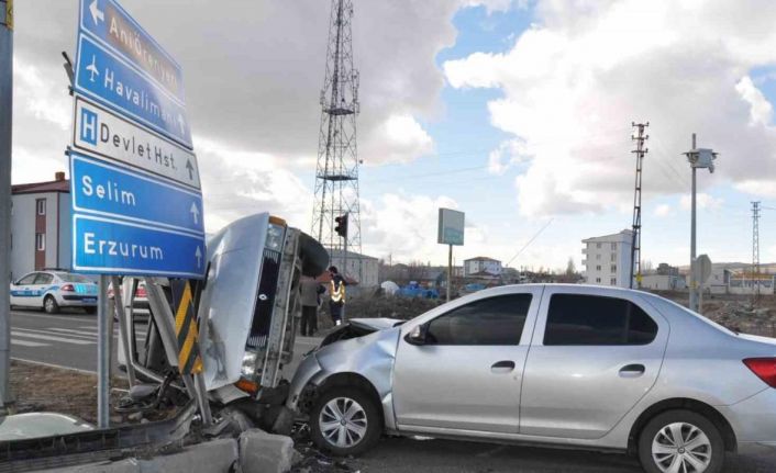 Kars’ta meydana gelen trafik kazasında 4 kişi yaralandı. Kazanın şiddetiyle kazaya karışan otomobillerden birisi yön levhaları ile refüj arasına yan yattı.