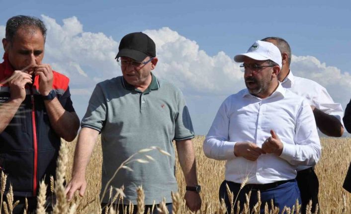 Tarlada buğday başaklarını inceleyen Polat ve Çalkın, üreticilerle bir araya gelerek taleplerini ve sorunlarını dinledi.