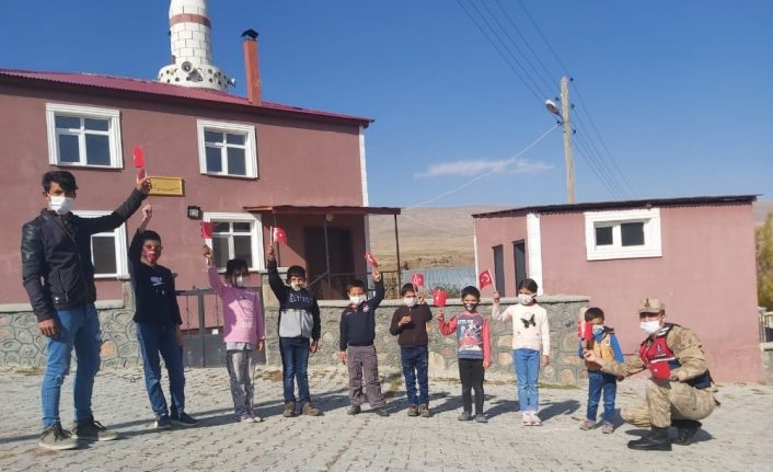 Jandarma ekipleri köydeki çocukları ziyaret ederek 29 Ekim Cumhuriyet Bayramını kutladı.