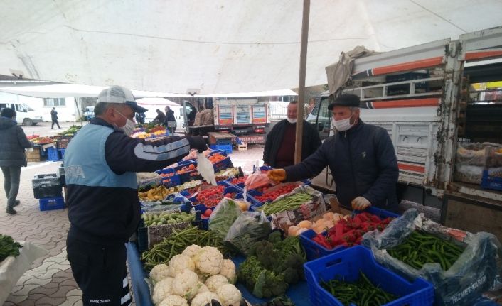 Kastamonu’nun Daday ilçesinde Belediye Zabıta ekipleri ile Daday İlçe Emniyet Amirliğine bağlı polis ekipleri tarafından korona virüse karşı alınan önlemler kapsamında öncelikle pazarcı esnafına maske ve eldiven kullanımı konusunda tebligatlar yapıldı. Ardından pazar yerinin girişinde Belediye ekiplerince vatandaşlara, el dezenfektanı sıkılarak, evlerinde kullanılmak üzere özel dezenfeksiyon ilacı dağıtıldı. Vatandaşların ateşlerini de ateş ölçer cihazı ile ölçen ekipler, maskesiz ve eldivensiz vatandaşların pazar yerine girişini engelledi. Vatandaşları maske ve eldiven kullanmaları yönünde uyaran ekipler, maske ve eldiveni olmayan vatandaşlara maske ve eldiven de dağıttı.