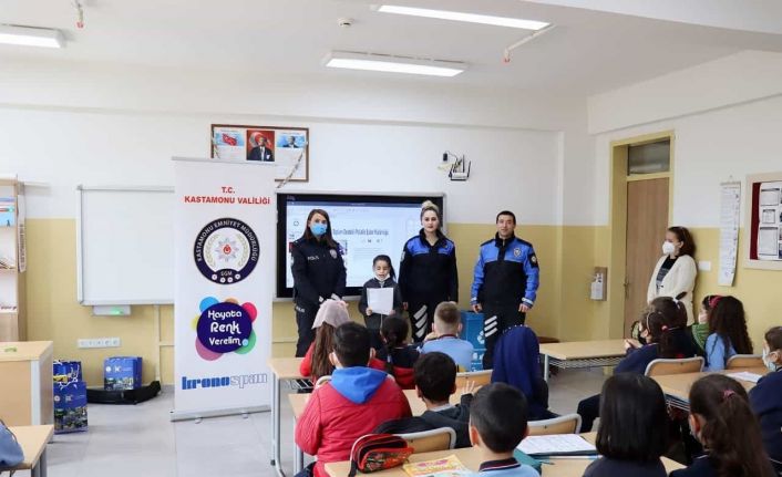 Kastamonu İl Emniyet Müdürlüğü Toplum Destekli Polislik Şube Müdürlüğü ekipleri tarafından “Hayata Renk Verelim 2022” sosyal sorumluluk projesi faaliyetleri çerçevesinde “Bilgilendirme-Bilinçlendirme” etkinliklerine yönelik olarak İl Milli Eğitim Müdürlüğü’ne bağlı Şehit Erkan Kendirci İlkokulu ve Mehmet Akif Ersoy İlkokulu ziyaret edildi. Ziyaretlerde eğitim görmekte olan öğrencilere temel güvenlik kuralları, güvenli internet kullanımı, sosyal medya bağımlılığı, polislik meslek tanıtımı, çevre, doğa ve hayvan sevgisi, güvenli geçiş alanları, yaya geçitleri ve alt geçitler hakkında bilgilendirmeler yapıldı ve Mehmet Akif Ersoy İlkokulu anasınıfı öğrencilerine animasyon filmi izlettirildi.