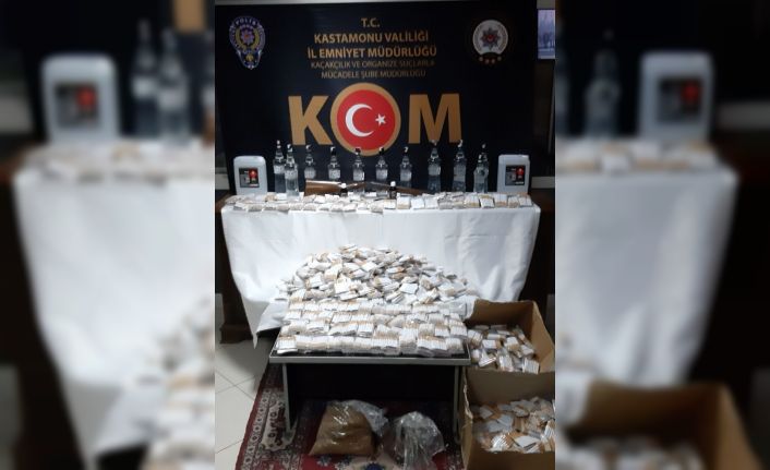 Edinilen bilgiye göre, Kastamonu İl Emniyet Müdürlüğü KOM Şube Müdürlüğü görevlilerince kaçak tütün ve yan ürünleri ile kaçak/sahte alkollü içki imal ve ticaretinin engellenmesine yönelik il merkezinde tespit edilen bir ikamete yönelik yapılan operasyonda; 1 adet ruhsatsız av tüfeği, 14 bin adet doldurulmuş makaron, 11 şişe sahte alkollü içki, 2 kilogram açık kıyılmış tütün, çok sayıda aroma ve solüsyon ürün ele geçirildi.