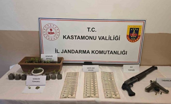 Edinilen bilgiye göre, Kastamonu İl Jandarma Komutanlığı ekiplerince uyuşturucu madde imal ve ticareti yapan şahıslara yönelik yürütülen çalışmalar neticesinde, tespiti yapılan H.A. isimli şahsın Cide ilçesindeki evinde arama yapıldı. Aramada bir miktar kenevir bitkisi ve 75 adet sahte ABD doları ve 2 adet silah ele geçirildi.