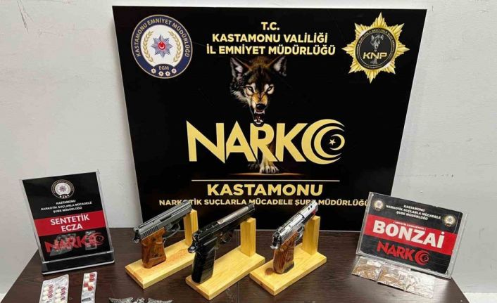 Edinilen bilgiye göre, Kastamonu İl Emniyet Müdürlüğü Narkotik Suçlarla Mücadele Şube Müdürlüğü ekiplerince Kastamonu’da uyuşturucu madde kullanan ve satan şahısların yakalanmasına yönelik yürütülen çalışmalar neticesinde, tespiti yapılan bir adreste arama yapıldı. Aramada, 3 adet ruhsatsız tabanca ve bu tabancalara ait 8 adet fişek, 1 adet muşta, 14 adet sentetik ecza, 3 adet fişeklenmiş halde toplam 2,15 gram kannabinoid ve 1 adet esrar öğütücü ele geçirildi.