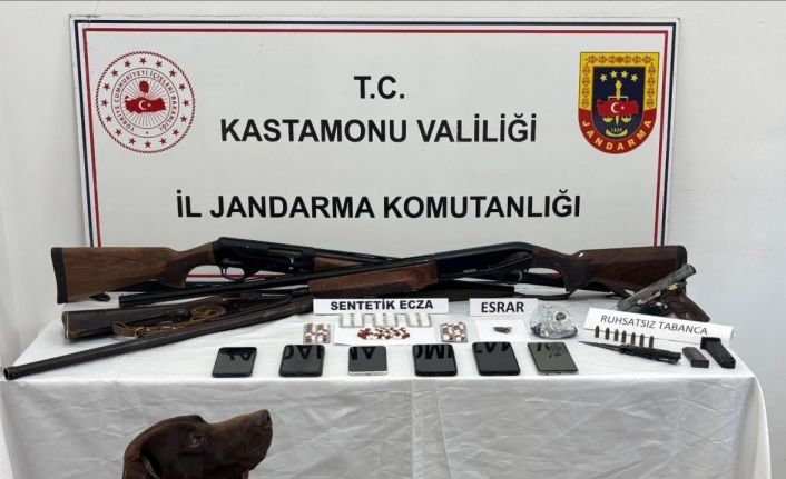 Edinilen bilgiye göre, Kastamonu İl Jandarma Komutanlığımızca uyuşturucuyla mücadeleye yönelik çalışmalar kapsamında düzenlenen operasyonda 92 adet sentetik ecza hapı, 2 gram metamfetamin, 16 mililitre sentetik kannabinoid katkılı tütün, 16 gram sentetik kannabinoid katkılı tütün, 1 gram kubar esrar, 3 adet uyuşturucu kullanma aparatı, 3 adet av tüfeği, 1 adet tabanca, 7 adet tabanca fişeği, 1 adet bıçak, 2 adet tabanca şarjörü, 6 adet cep telefonu ele geçirildi.
