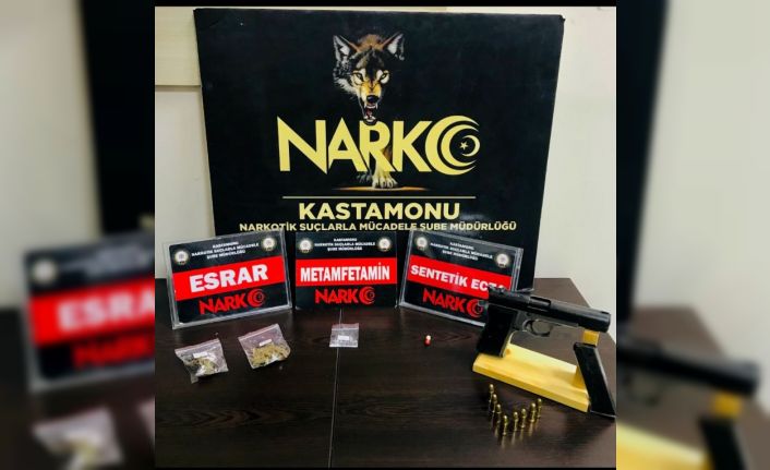 Edinilen bilgiye göre, Kastamonu İl Emniyet Müdürlüğü Narkotik Suçlarla Mücadele Şube Müdürlüğü ekipleri tarafından uyuşturucu madde kullanan ve satan şahısların yakalanması için yürütülen çalışmalar çerçevesinde, il merkezinde durdurulan bir otomobilde arama yapıldı. Aramada çeşitli miktarlarda esrar, metanfetamin, reçeteye tabii hap, ruhsatsız tabanca ve tabancaya ait fişekler ele geçirildi.