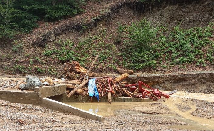 Kastamonu’nun Hanönü ilçesi Gökceağaç köyü ormanlık alanında orman köylüsü tarafından bırakılan bir kepçe ile bir traktör, sel sularına kapılarak kullanılamaz hale geldi.