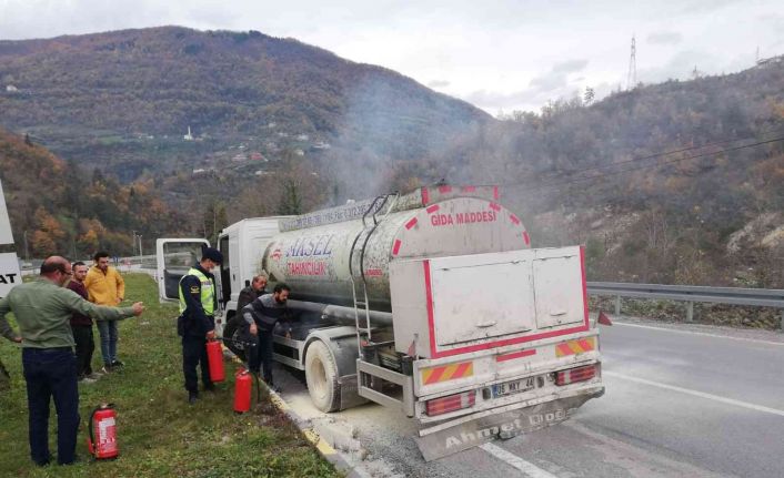 Olay, Kastamonu’nun İnebolu ilçesi Kastamonu-İnebolu karayolu İkiçay mevkiinde meydana geldi. Edinilen bilgiye göre, İnebolu istikametinde seyir halinde olan A.Ö. idaresindeki 06 MKY 44 plakalı gıda maddesi yüklü tankerin lastiği alev aldı. Lastiği yanan tankere İnebolu İlçe Jandarma Komutanlığı Trafik Timi ekipleri, yangın söndürme tüpleri ile müdahale etti. Yanan lastikler, ekiplerin erken müdahalesiyle büyümeden söndürüldü.
