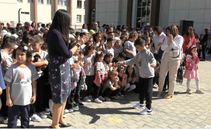 Kastamonu’da tatilin bitmesi ile okula dönen bir öğrenci, tören sırasında öğretmeniyle karşılıklı göbek atarak okulların açılışını kutladı.