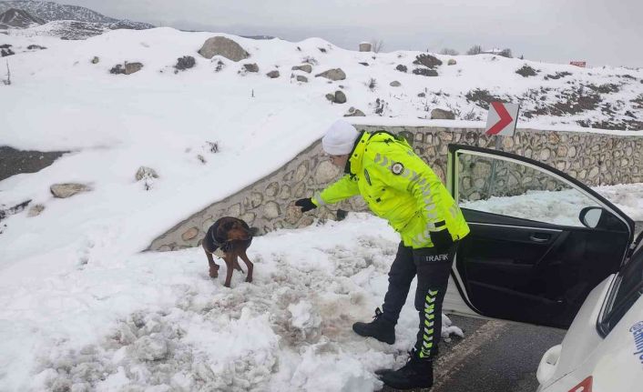 Edinilen bilgiye göre, D100 karayolunda yol kontrolü için devriye çalışmasına katılan Tosya İlçe Emniyet Müdürlüğü Tosya Bölge Trafik Denetleme İstasyonu Amirliği ekipleri, yol kenarında yatan bir köpeği fark etti. Ekipler, durumundan şüphelenerek kontrol ettikleri köpeğin yaralı olduğunu gördü. Yaralı köpeğe su ve ekmek veren ekipler, kucaklarına alarak ekip aracının yanına getirttiler.
